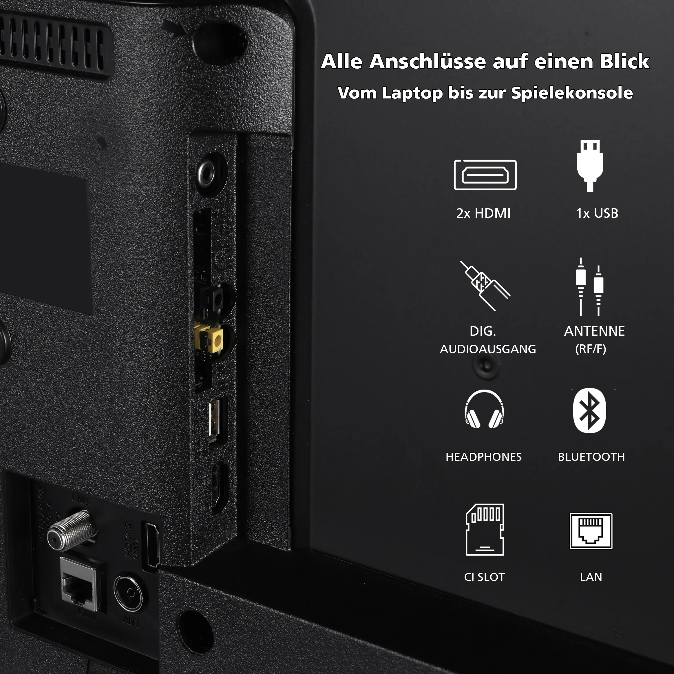 - Anschlüsse: 3x HDMI, 2x USB, CI+, WLAN, Bluetooth