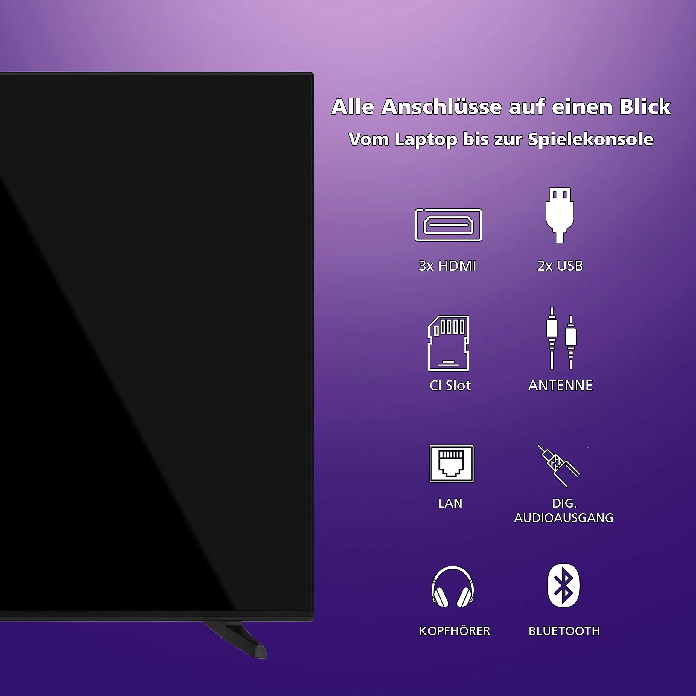 - Anschlüsse: 3x HDMI (CEC + ARC), 2x USB mit Media-Player, CI+, optischer Ausgang u.v.m.