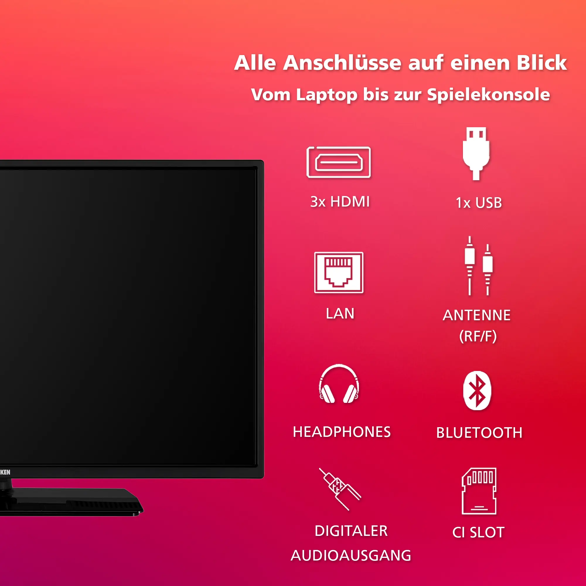 - Anschlüsse: 3x HDMI (CEC + ARC), 2x USB, CI+, WLAN