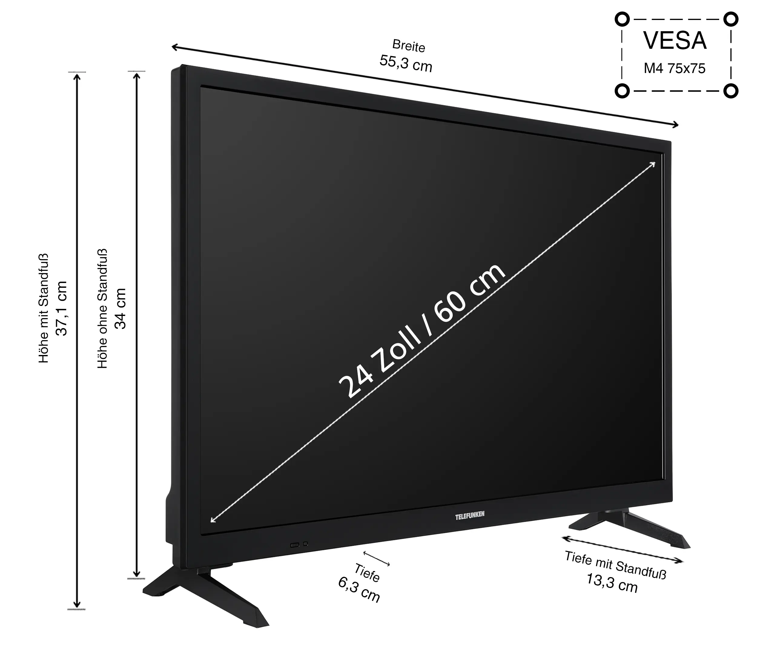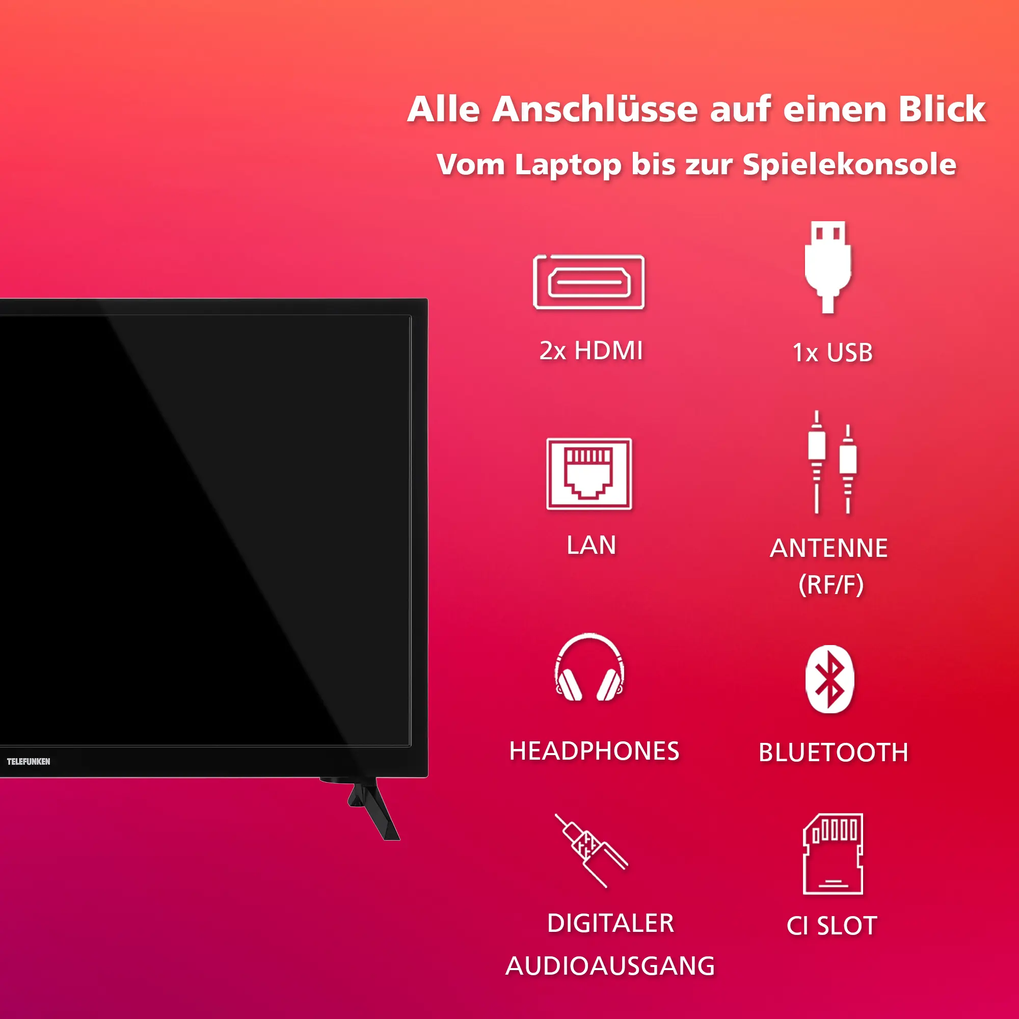 In elegantem Design vereint der XH24TO550S Smart TV von Telefunken alles, was Fernsehen heute zum Erlebnis für dich und deine Familie macht. Das auf eine Bildschirmdiagonale von 60 cm (24 Zoll) dargestellte Bild überzeugt in HD Auflösung. Der TV unterstützt außerdem HDR10 inkl. HLG, Super Resolution und Micro Dimming und liefert damit kontrastreiche Aufnahmen mit einer natürlichen Farbgebung und beeindruckender Detailschärfe.