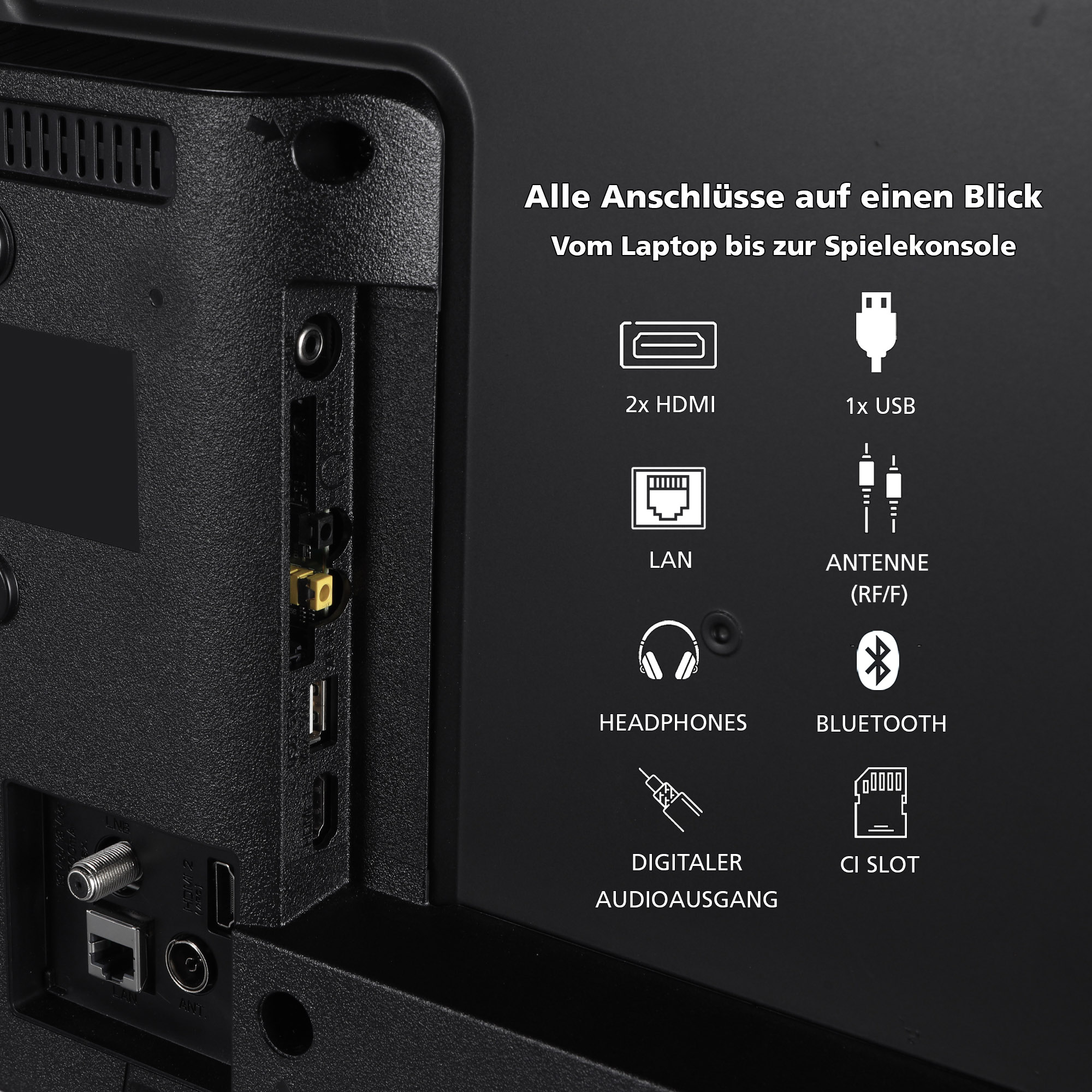Der integrierte Triple-Tuner (DVB-C/T2/S2) macht’s möglich: Du empfängst deine Lieblingssender über Kabel, Satellit oder Antenne – ohne zusätzlichen Receiver. Über 2x HDMI (CEC + ARC), 1x USB, CI+, WLAN und Bluetooth verbindest du einfach weitere Geräte oder spielst Medien direkt ab.
